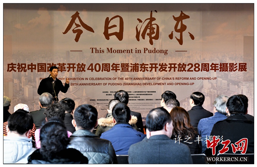 2018年12月10日,“今日浦东——庆祝中国改革开放40周年暨浦东开发开放28周年摄影艺术展”在北京世纪坛举行。中国多位摄影家用镜头中的精彩瞬间展现浦东开发开放的奋斗历程。图为摄影展开幕式。工人日报-中工网记者许之丰摄影报道
