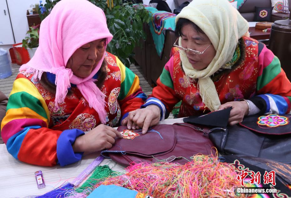 12月10日,土族妇女交流盘绣技术。当日,在青海省海东市互助县扶贫产业园内,10余名土族农村妇女共同学习土族盘绣技法。土族盘绣于2006年被列入国家级非物质文化遗产保护名录,是土族文化重要标志之一。中新社记者 马铭言 摄