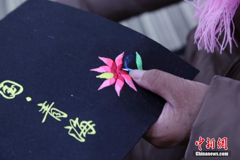 12月10日,针脚细腻、层次鲜明的土族盘绣。土族盘绣于2006年被列入国家级非物质文化遗产保护名录,是土族文化重要标志之一。中新社记者 马铭言 摄