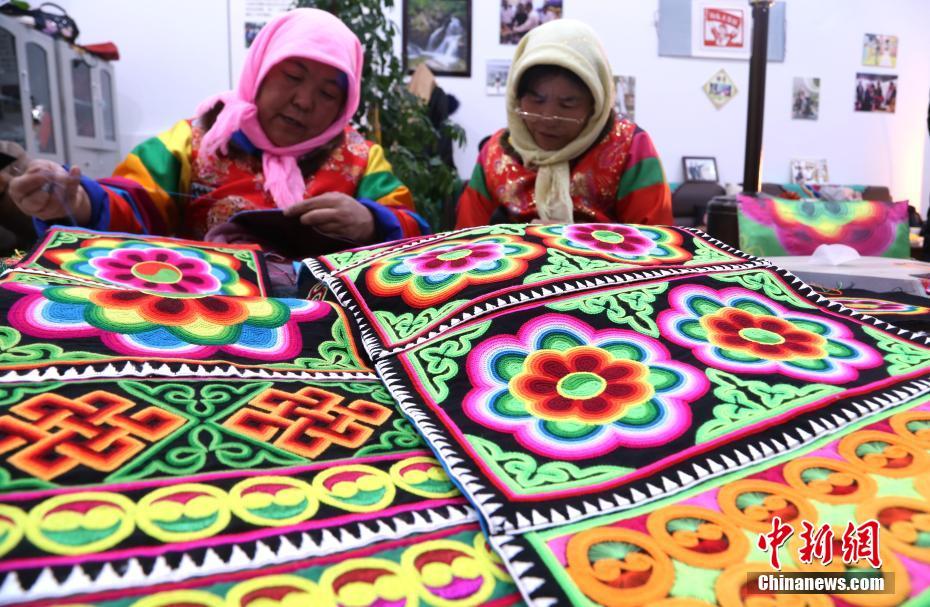 12月10日,针脚细腻、层次鲜明的土族盘绣。当日,在青海省海东市互助县扶贫产业园内,10余名土族农村妇女共同学习土族盘绣技法。土族盘绣于2006年被列入国家级非物质文化遗产保护名录,是土族文化重要标志之一。中新社记者 马铭言 摄