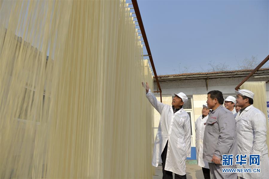 12月11日,在河北省临西县东尖冢村,省级非遗传承人王敬达(左一)为村民讲解手工挂面晾晒方法。新华社发(陈雷 摄)