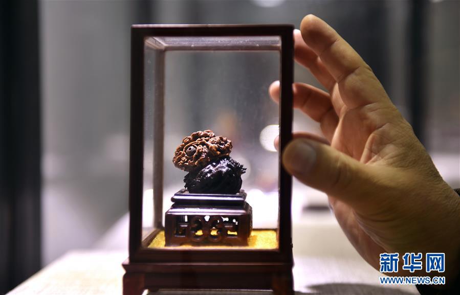 12月12日,韩志耀在工作室查看自己的核雕作品。 新华社记者 姚剑锋 摄