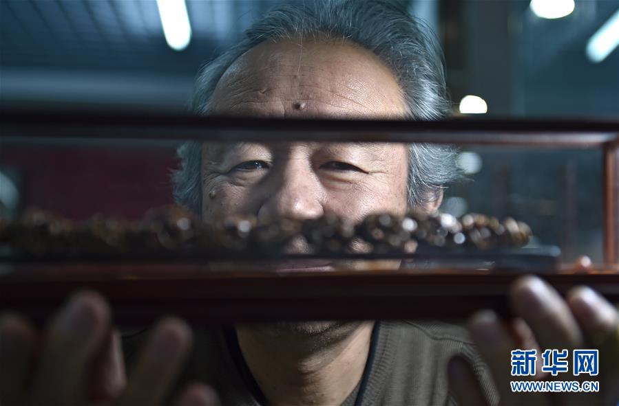 12月12日,韩志耀在工作室查看自己的核雕作品。新华社记者 钱一 摄
