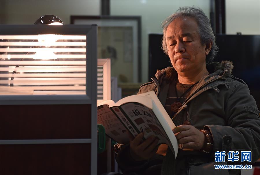 12月12日,韩志耀在工作室阅读书籍《说文解字》,寻找创作灵感。 新华社记者 钱一 摄