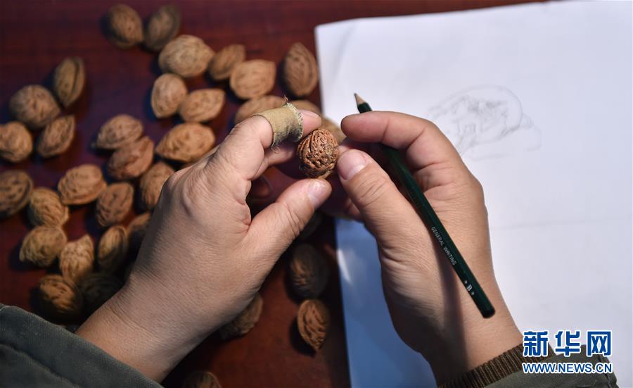12月12日,韩志耀在工作室挑选雕刻需用的桃核。新华社记者 钱一 摄