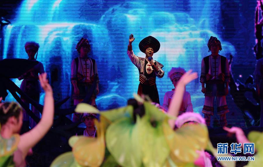12月13日,湖南省张家界魅力湘西艺术团歌手段勇(后排左三)在舞台上演唱桑植民歌《马桑树儿搭灯台》。 具有浓郁民族特色的湖南桑植民歌曲调丰富多变,旋律优美动听,在高唱低吟中显现出独特的艺术魅力,至今广为传唱。2006年,桑植民歌被列入第一批国家级非物质文化遗产名录。 近年来,张家界艺术团体根据桑植民歌的曲调、创作来历和大意,编排了舞蹈、杂技等多项演出形式,与民歌一起融合表演,让非遗民歌绽放新光彩。 新华社发(吴勇兵 摄)