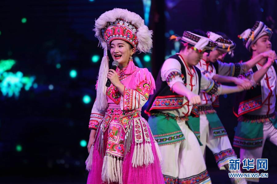 12月13日,湖南省张家界魅力湘西艺术团歌手段红霞(左一)在舞台上演唱桑植民歌《马桑树儿搭灯台》。 具有浓郁民族特色的湖南桑植民歌曲调丰富多变,旋律优美动听,在高唱低吟中显现出独特的艺术魅力,至今广为传唱。2006年,桑植民歌被列入第一批国家级非物质文化遗产名录。 近年来,张家界艺术团体根据桑植民歌的曲调、创作来历和大意,编排了舞蹈、杂技等多项演出形式,与民歌一起融合表演,让非遗民歌绽放新光彩。 新华社发(吴勇兵 摄)