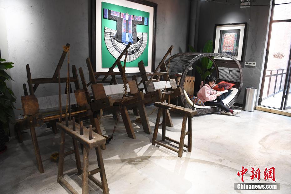12月17日,广西南宁市非遗生活馆内,一民众在老织布机旁歇息。据了解,此家非遗生活馆通过将壮乡非遗文化融入现当下各式潮流单品中,制作了皮具、服饰、背包等文创产品。民众可在生活馆内感受壮乡非遗文化的魅力。中新社记者 俞靖 摄