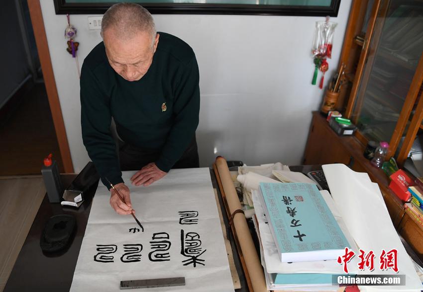 12月17日,长春市民王学斌在家中展示自己书写的“寿”字。今年83岁的王学斌历时三年写了一本《十万寿谱》,这本《十万寿谱》都是用小篆体书写而成的,书写寿字的部分一共700页,共计有100100个“寿”字。另外,王学斌自1995年开始写寿字,至今已书写“寿”字近20万个。张瑶 摄