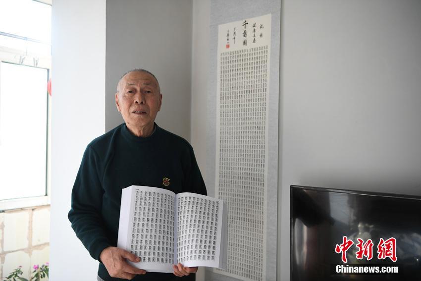 12月17日,长春市民王学斌在家中展示自己书写的“寿”字。今年83岁的王学斌历时三年写了一本《十万寿谱》,这本《十万寿谱》都是用小篆体书写而成的,书写寿字的部分一共700页,共计有100100个“寿”字。另外,王学斌自1995年开始写寿字,至今已书写“寿”字近20万个。张瑶 摄