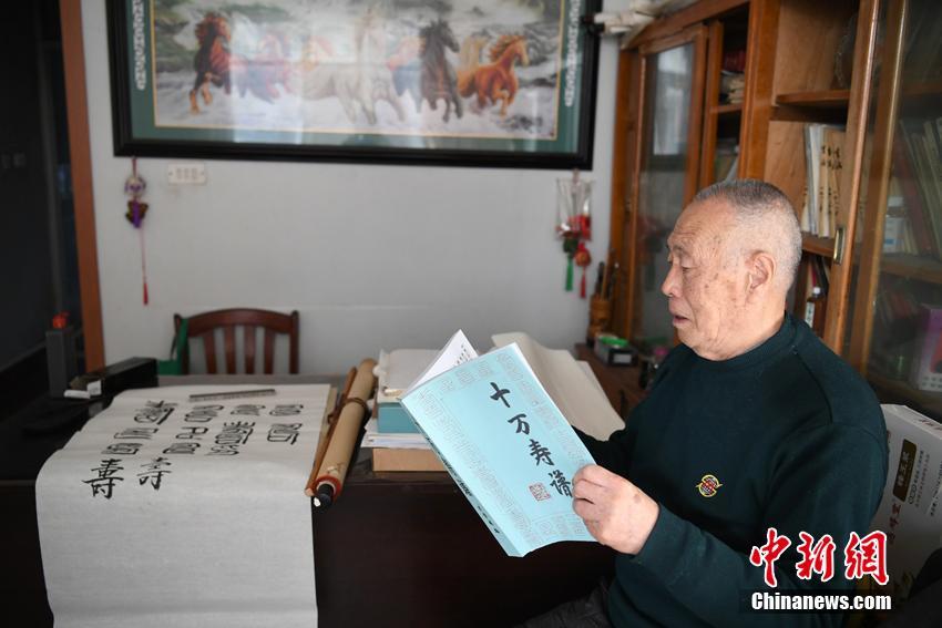 12月17日,长春市民王学斌在家中展示自己书写的“寿”字。今年83岁的王学斌历时三年写了一本《十万寿谱》,这本《十万寿谱》都是用小篆体书写而成的,书写寿字的部分一共700页,共计有100100个“寿”字。另外,王学斌自1995年开始写寿字,至今已书写“寿”字近20万个。张瑶 摄