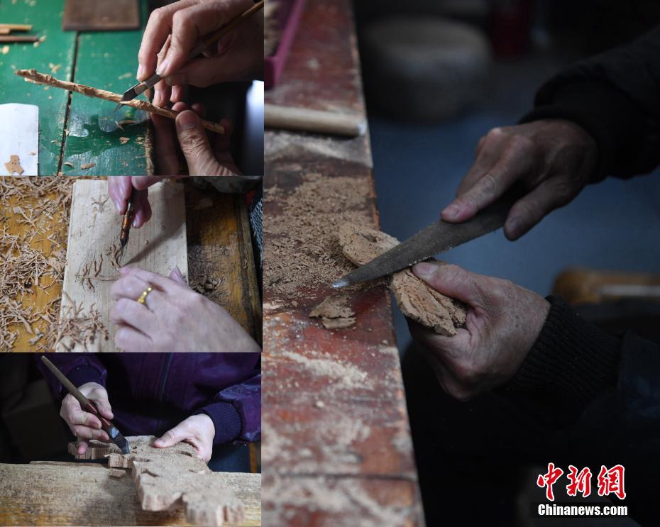 老艺人们正在雕刻软木画所需的各种配件。通常一幅软木画作品由四五个人完成,分别进行亭台、楼阁、树木、动物、人的制作,及布景设计。(拼接图片)张斌 摄