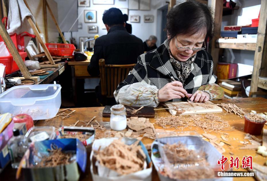 软木画老艺人陈雪榕正在工作台上进行雕刻。张斌 摄