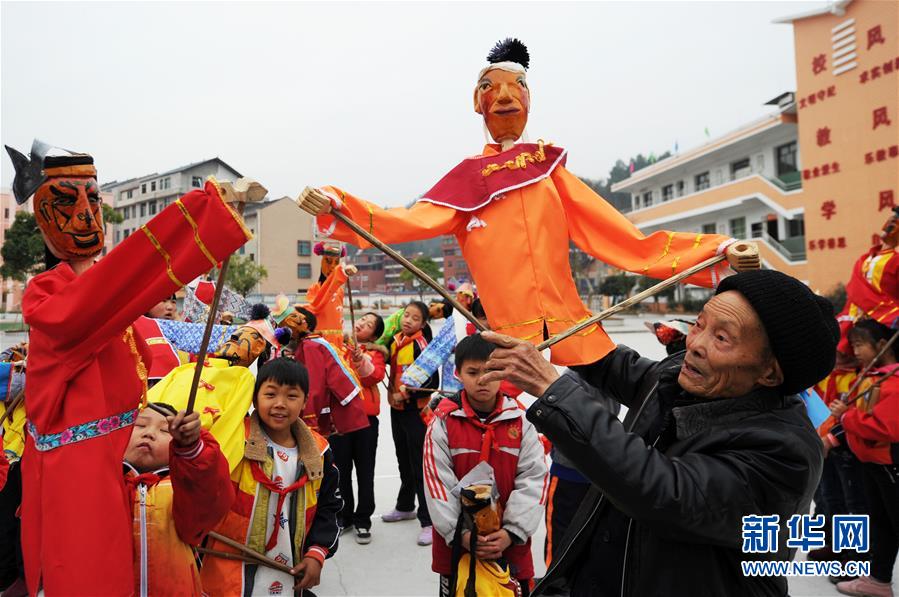 近年来,为传承和保护石阡木偶戏,贵州省石阡县将木偶戏引入校园,定期邀请传承人到学校为师生指导授课。学校还通过兴趣活动课、课间集体展示等方式,让石阡木偶戏这一古老民间艺术形式在校园中得以展示和传承。