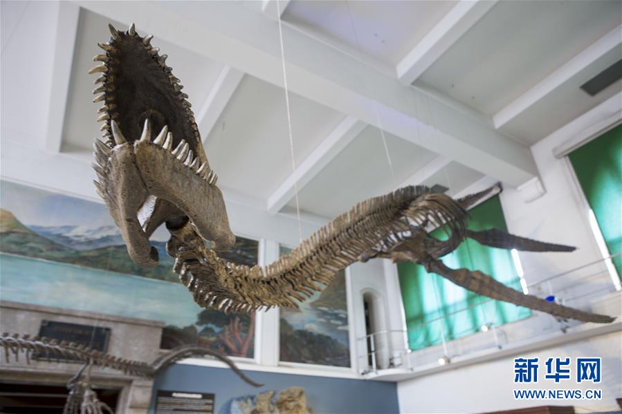 这是12月19日在阿根廷自然科学博物馆拍摄的蛇颈龙骨架化石的复制品。