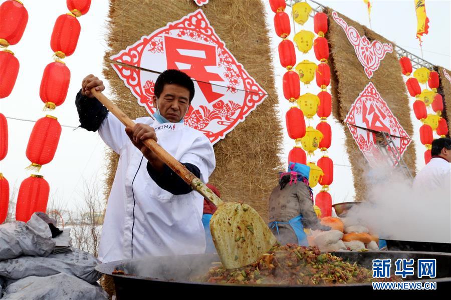 12月22日,在甘肃省张掖市山丹县清泉镇祁店村,厨师在烹制当地特色大锅饭“牛娃子饭”,供村民和游客分享。新华社发(成学磊 摄)