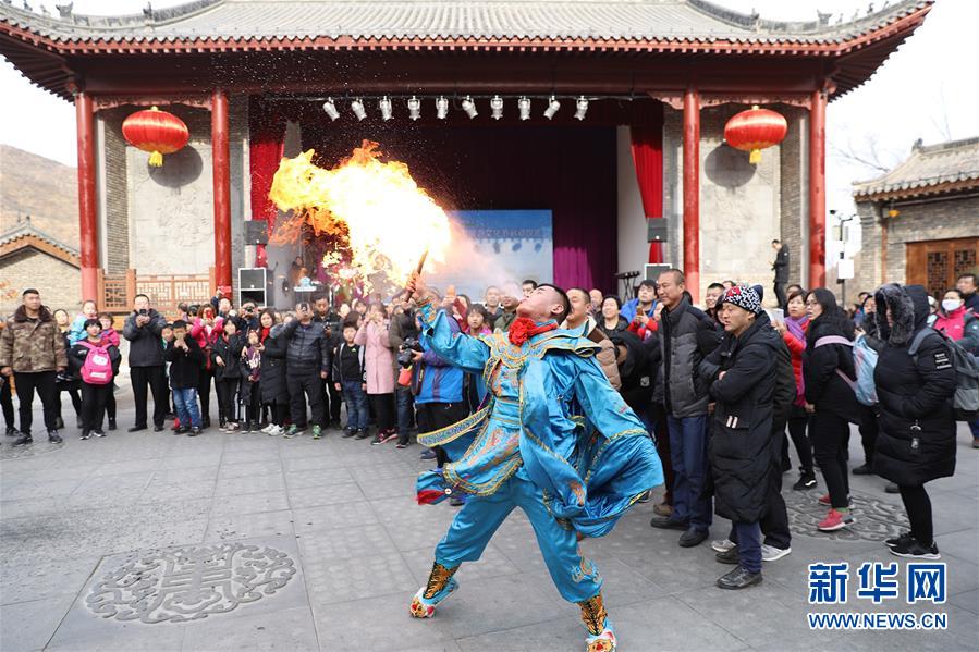 12月22日,在河北省石家庄市平山县红崖谷景区内,游客欣赏传统民俗表演。 新华社发(梁子栋 摄)