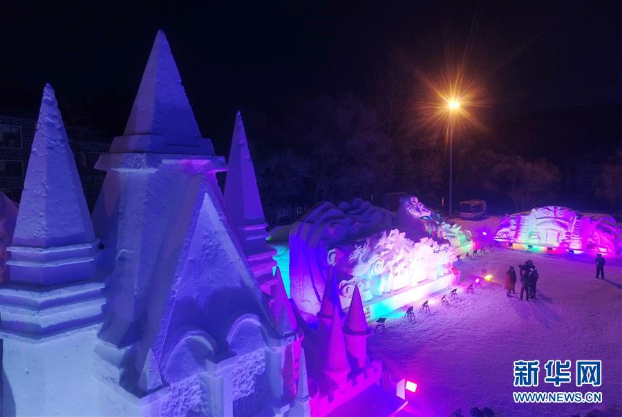 12月23日,游客在位于牡丹江市镜泊湖景区内的雪堡里游玩。 当日,黑龙江省牡丹江市冬季旅游项目雪堡开园迎客,园内设计有“雪城之光”“雪堡游乐岛”“冰雪探秘园”等六大区域,造型别致的雪雕作品吸引不少游客。 新华社发(张春祥 摄)