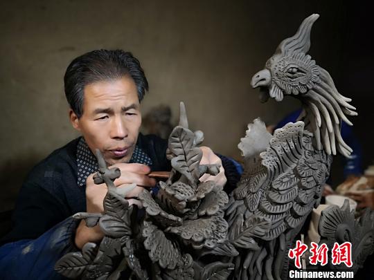 图为刘泉泥塑的作品“凤戏牡丹”。 魏建军 摄