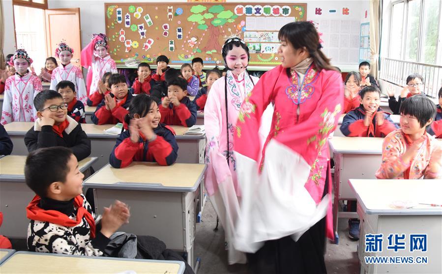 12月25日,昆剧少年班的学生与音乐老师一起在课堂上表演昆剧节目。 近日,浙江省建德市大慈岩中心小学昆剧少年班的10多名学生在老师的指导下排练剧目,为学校迎接新年节目表演做好准备。该校自2009年开设昆剧课程,并成立昆剧少年班,由民间艺人与学校音乐老师共同教学,辅导学生们掌握基本戏剧知识和表演动作,使这项传统戏剧艺术得到传承。 新华社发(宁文武 摄)