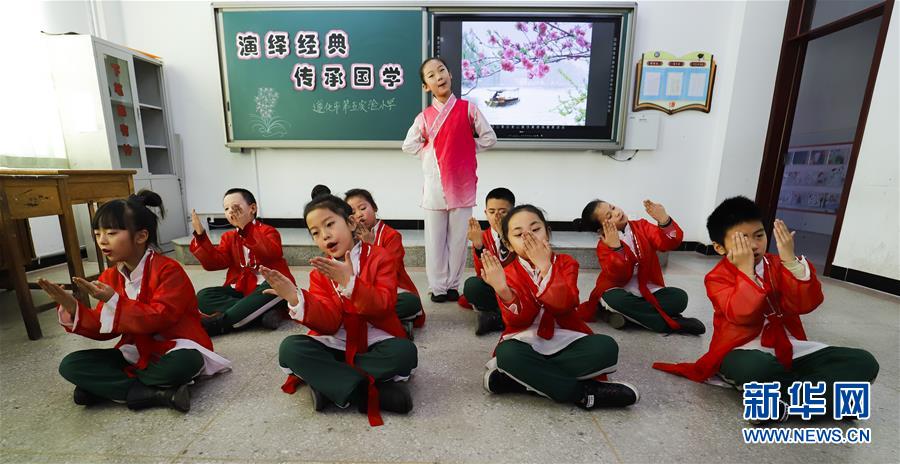12月25日,河北省遵化市第五实验小学学生在诵读《弟子规》。 当日,河北唐山遵化市第五实验小学举行传统文化校园日活动,学生们通过学习传统戏曲表演、经典诵读、书法比赛、诗词笔试等活动,感受传统文化魅力。 新华社发(刘满仓 摄)