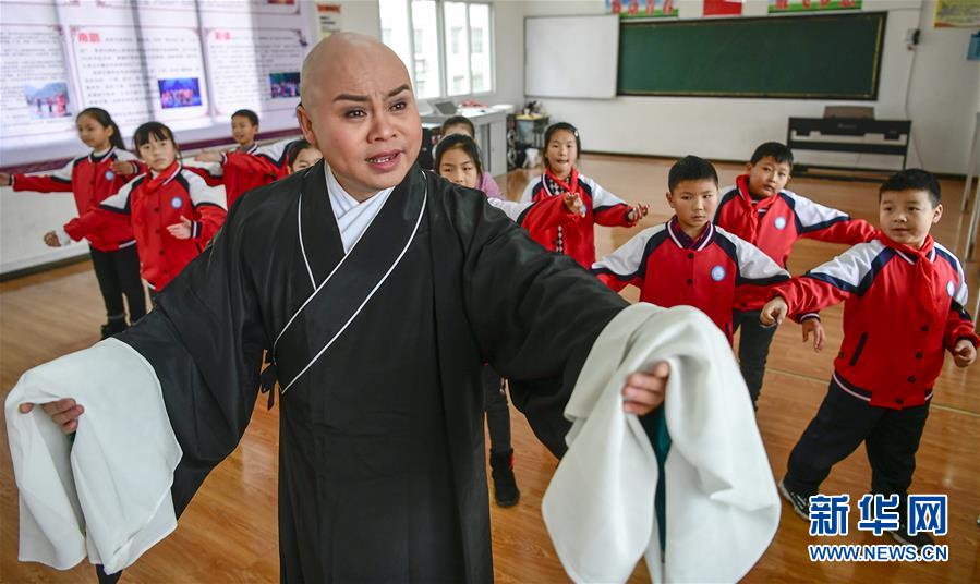 12月26日,在湖北省来凤县民族小学,该县南剧传习研究所工作人员在给学生教授南剧唱腔。