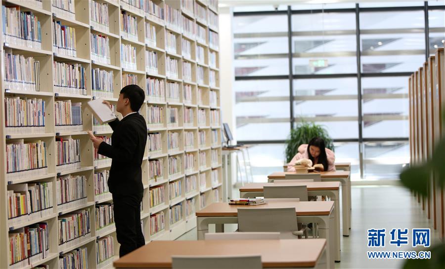 12月27日,在天津滨海新区图书馆,工作人员(左)在阅览室中摆放图书。 滨海新区图书馆位于天津滨海文化中心,2017年10月1日正式开馆,设计立意为“滨海之眼”和“书山有路勤为径”。图书馆现有藏书60多万册,一年多来接待读者约280万人次,已成为滨海新区的文化“新地标”。 新华社记者伍婧丹摄