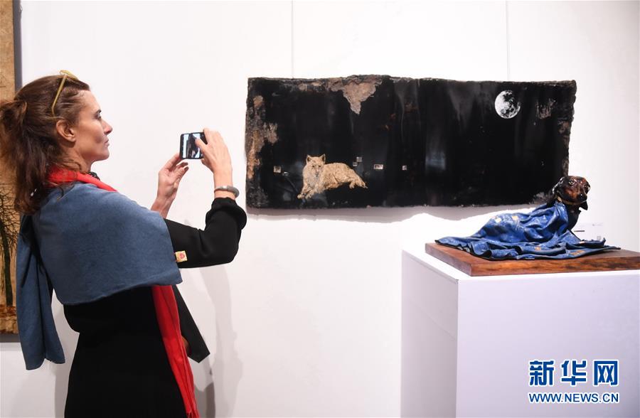 12月27日,参观者在双年展上拍摄展出的作品。当日,2018福州国际漆艺双年展在福州朱紫坊历史文化街区开幕,共展出180多名艺术家的近300件作品。新华社记者 林善传 摄
