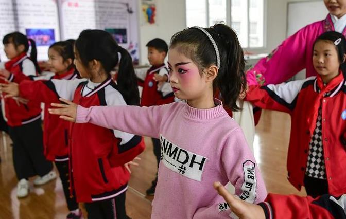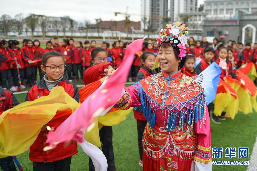 12月27日,在贵州省余庆县城关一小,民间艺人在教学生们跳花灯动作。 当日,贵州省遵义市余庆县组织民间文艺队走进城关一小,为师生们带来精彩的跳花灯、打钱杆等非遗表演,并与学生们互动,让学生们近距离感受传统文化的魅力。 新华社发(贺春雨 摄)