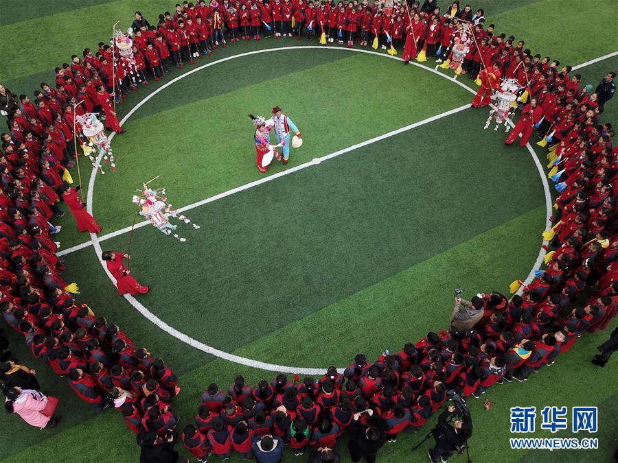 12月27日,贵州省余庆县城关一小的学生在观看跳花灯表演(无人机拍摄)。 当日,贵州省遵义市余庆县组织民间文艺队走进城关一小,为师生们带来精彩的跳花灯、打钱杆等非遗表演,并与学生们互动,让学生们近距离感受传统文化的魅力。 新华社发(贺春雨 摄)