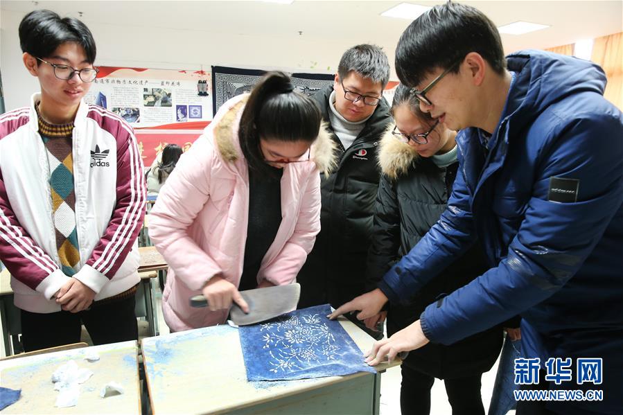 12月27日,学生们在蓝印花布课堂上体验“刮灰”。 当日,江苏南通开放大学“非遗进课堂 文化有传承”素质教育工程正式启动,沈绣、蓝印花布、板鹞风筝、棕编、剪纸、红木雕刻等7个非遗项目传承人走进课堂,让学生零距离感受非遗的魅力。 新华社发(许丛军 摄)