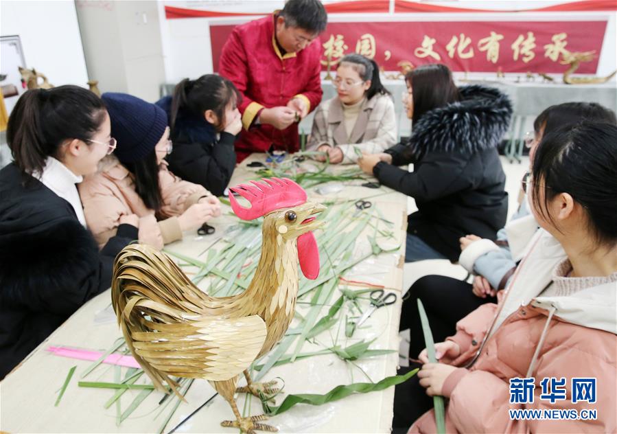 12月27日,学生们在棕编课堂上学习棕编。 当日,江苏南通开放大学“非遗进课堂 文化有传承”素质教育工程正式启动,沈绣、蓝印花布、板鹞风筝、棕编、剪纸、红木雕刻等7个非遗项目传承人走进课堂,让学生零距离感受非遗的魅力。 新华社发(许丛军 摄)