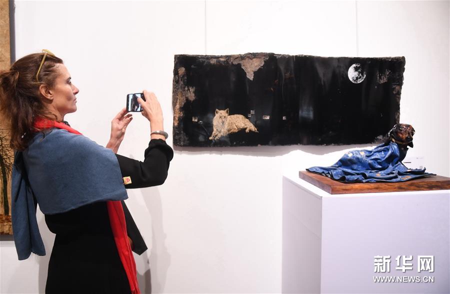 12月27日,参观者在双年展上拍摄展出的作品。 当日,2018福州国际漆艺双年展在福州朱紫坊历史文化街区开幕,共展出180多名艺术家的近300件作品。 新华社记者 林善传 摄