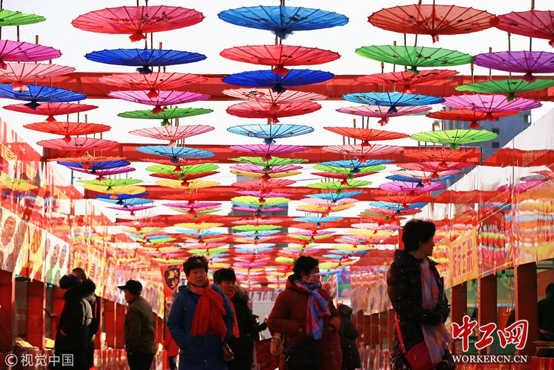 2018年12月28日,安徽淮北市民在观赏油纸伞风情展。当日,安徽省淮北市一小区广场色彩斑斓的油纸伞如花绽放,为新年的到来营造出浓浓的节日氛围,吸引众多市民前来感受伞韵之美。(图片来源:视觉中国)