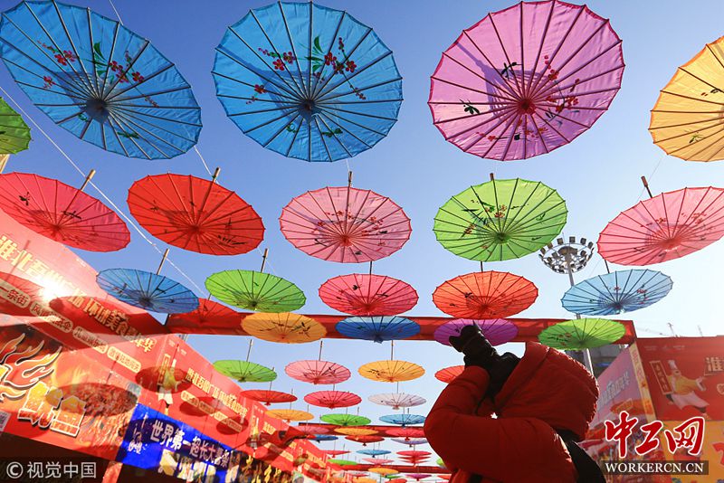 安徽淮北:古风油纸伞展出 五彩斑斓衬托新年氛围浓