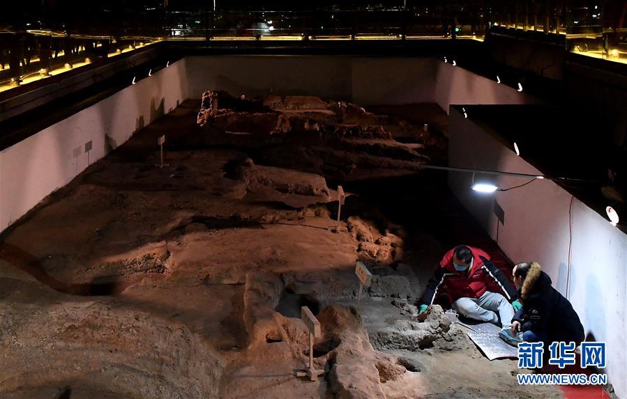 在河南郑州大河村遗址博物馆,科研人员在对仰韶文化房基进行体检、加固(12月11日摄)。