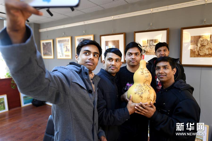 12月28日,河北工业职业技术学院孟加拉国留学生自拍烙画作品纪念照。 近年来,河北工业职业技术学院实施“非遗文化进校园”工程,把内画、烙画等富有特色的民间非遗项目引入教学中,让学生们体验传统技艺,感受非遗魅力。新华社记者 薛东梅摄