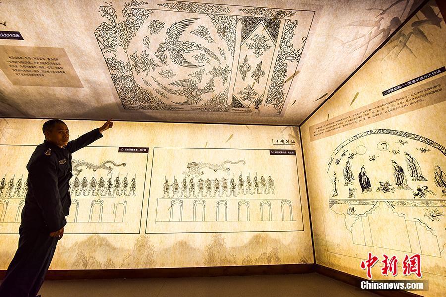 12月28日,湖南桂阳县刘家岭壁画墓陈列馆开馆,免费对观众开放。刘家岭壁画墓于2010年发掘,墓葬内甬道、墓室皆有精美壁画,真实形象地反映了古代社会生活、丧葬习俗。该墓葬是唐代以后北方贵族南迁的重要历史见证,是迄今为止发现的位于中国最南端的保存最为完整的古代壁画墓,具有较高的历史、艺术、科学研究价值。图为古墓壁画展区。通讯员 欧阳常海 摄