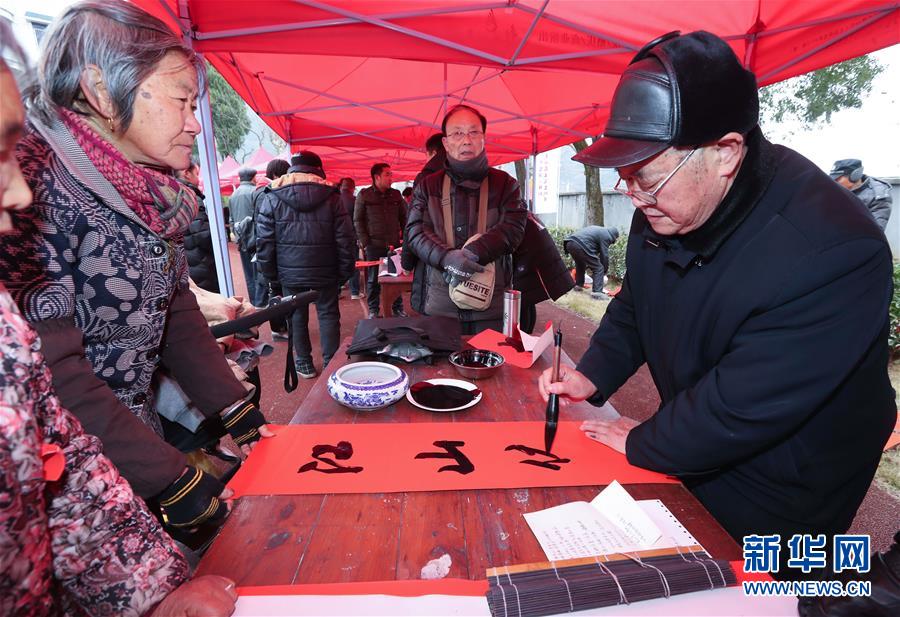 12月30日,淳安县梓桐镇农民书法家在现场写字。 新华社记者 徐昱 摄