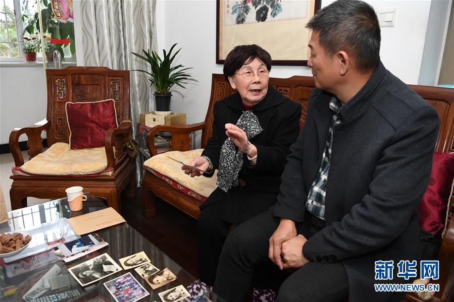 在原“福建前线广播电台”广播员陈菲菲厦门的家中,陈菲菲老人向到访的台胞陈清隆诉说当年厦门向金门广播的历史(2018年12月30日摄)。 新华社记者 姜克红 摄