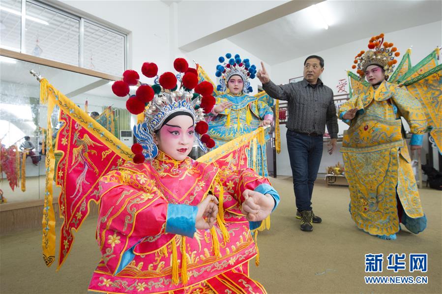 1月5日,在江苏南通海安市城东镇西场小学,学生在京剧老师的指导下练习京剧表演。 近年来,江苏南通海安市城东镇西场小学将京剧艺术教育列入该校课程,聘请专业剧团的京剧老师定期来校上课,让乡村的孩子们近距离感受国粹的魅力。 新华社发(徐劲柏 摄)