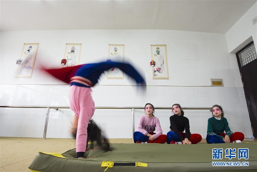 1月5日,在江苏南通海安市城东镇西场小学,学生在练习京剧基本功。 近年来,江苏南通海安市城东镇西场小学将京剧艺术教育列入该校课程,聘请专业剧团的京剧老师定期来校上课,让乡村的孩子们近距离感受国粹的魅力。 新华社发(徐劲柏 摄)