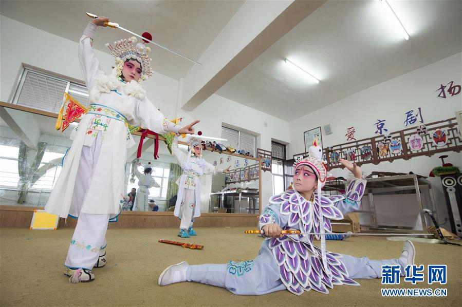 1月5日,在江苏南通海安市城东镇西场小学,学生在练习京剧表演。 近年来,江苏南通海安市城东镇西场小学将京剧艺术教育列入该校课程,聘请专业剧团的京剧老师定期来校上课,让乡村的孩子们近距离感受国粹的魅力。 新华社发(徐劲柏 摄)