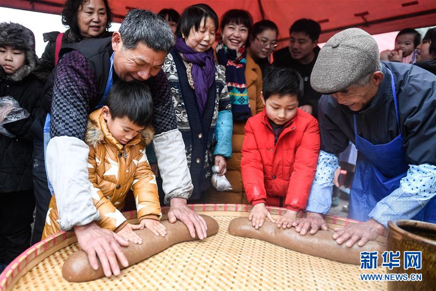 1月5日,村民与游客在年猪文化节上一起制作年糕。 春节临近,浙江省湖州市吴兴区妙西镇龙山村举办第四届年猪文化节,村民与游客们观摩传统的杀年猪仪式,一起打年糕、包饺子、看表演,感受浓浓的民俗风情。 新华社记者 黄宗治 摄