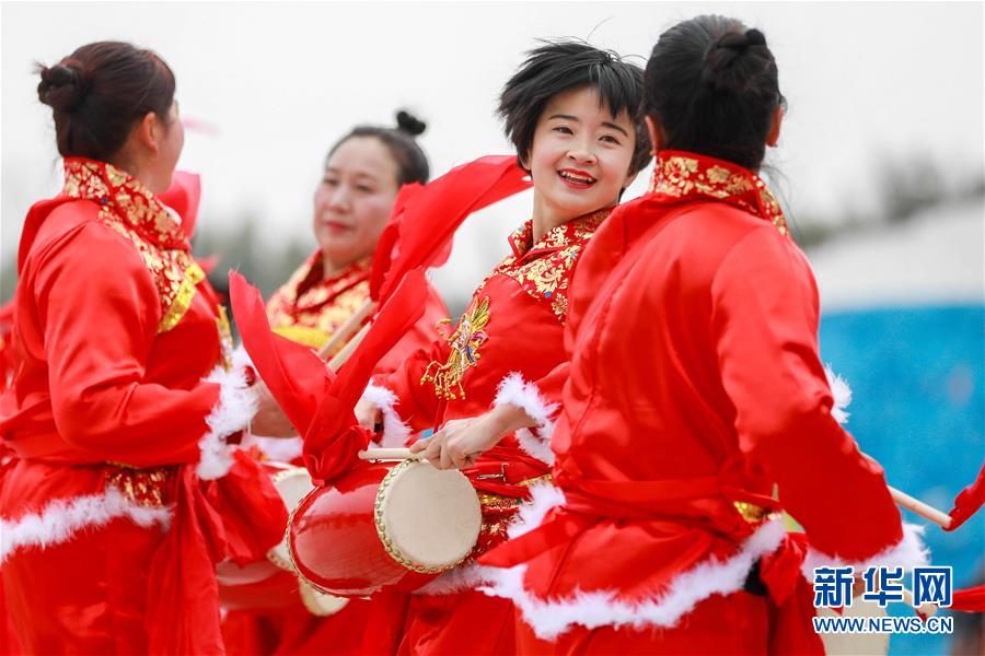 1月6日,在江苏省淮安市盱眙县穆店镇大桥村,张昀(右二)与村民一起跳腰鼓。新华社发(周海军 摄)