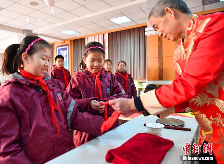 1月8日,河北石家庄桥西区南马路小学邀请河北省非物质文化遗产“南花园民间戏法”代表性传承人、古彩戏法表演艺术家贾海水,为孩子们演绎了“空手染巾”“吹扣自开”“空袋变蛋”“金杯入地”“破扇还原”等传统戏法,并与学生互动,让学生们近距离感受中国传统文化的魅力。图为贾海水教一对双胞胎“吹扣自开”戏法。中新社记者 翟羽佳 摄