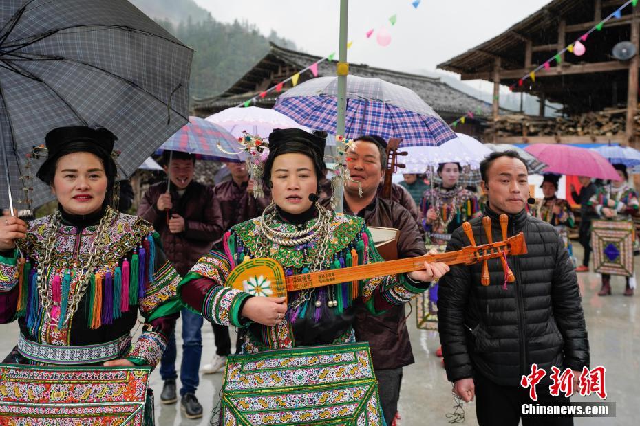 1月8日,贵州榕江宰挡侗寨,侗族妇女弹唱琵琶歌欢迎姑妈回娘家过侗年。当日,贵州省黔东南苗族侗族自治州榕江县宰挡侗寨百余名外嫁的“姑妈”在“姑爷”的陪伴下身着侗族盛装,抬着鸡、鸭、鱼、肉、酒等礼品组成队伍回到“娘家”,齐聚一堂,进行踩歌堂、唱琵琶歌,欢庆侗族新年。中新社记者 贺俊怡 摄