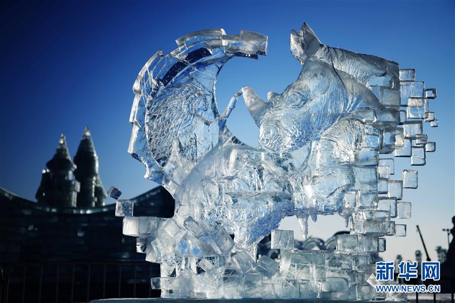 这是获得三等奖的中国天刃雕塑队的作品《心有灵犀》(1月8日摄)。 当日,在哈尔滨冰雪大世界园区进行的第三十三届中国哈尔滨国际冰雕比赛落下帷幕。 新华社记者王建威摄