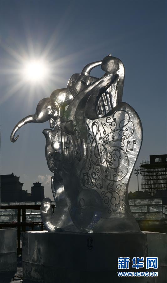 这是获得一等奖的蒙古一队冰雕作品《音乐知我心》(1月8日摄)。 当日,在哈尔滨冰雪大世界园区进行的第三十三届中国哈尔滨国际冰雕比赛落下帷幕。 新华社记者王松摄