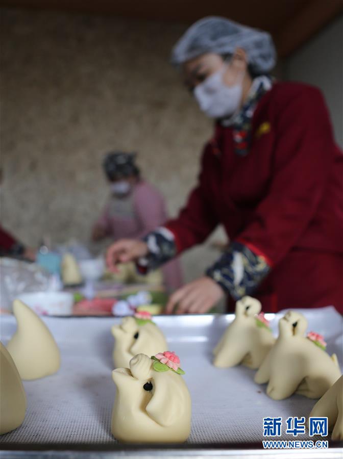 1月8日,工作人员在手工制作花饽饽。 新华社记者 丁洪法 摄